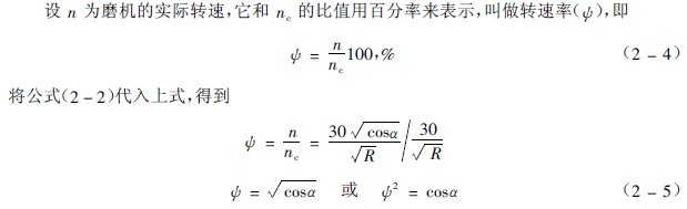 即角a標志鋼球開始拋落時已升到的位置,叫做脫離角。公式(2-5)指出,轉速率愈高,脫離角愈小,鋼球上升到的位置愈高。當脫離角為0時,轉速率為1,即實際轉速已等于臨界轉速,鋼球到了磨機的頂點,要開始離心化了。