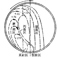 如圖所示,新給礦中的小粒,由給料端進入,沿A面均勻地落于筒體底部中心,然后向兩側擴散。大塊具有較大的動能,總是趨向較遠的一側,但其中有一部分必然要和AB面相碰,然后向另一側返回,因之,也使大塊得到均勻分布。A——A、B——B 在這里的作用是防止給入物料有害的偏析。自排礦端沿下面返回的顆粒如同新給料中的細粒一樣,均勻地落于筒體底部的中,然后向兩邊擴散。大塊和細粒在筒體底部沿軸向運動,方向正好相反,于是產生磨剝作用。