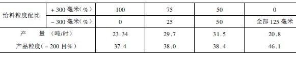 表1給料粒度配比對自磨機產(chǎn)量、產(chǎn)品粒度的影響