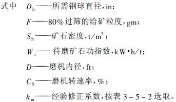 式(5-2)不能直接使用,必須針對(duì)特定礦石作兩組試驗(yàn),列出兩個(gè)方程式成一組,從方程組求解出i及n才能得出特定的球徑方程式,方可應(yīng)用。為了方便應(yīng)用,K.A拉蘇莫夫提出,對(duì)中硬礦石可以直接使用下面的簡(jiǎn)便計(jì)算式計(jì)算Db(mm)
