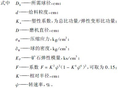 J.N.尼吉曼(Nijiman)的研究認為,球徑Db與給礦粒度d之間應有恰當的關系,并提出以為半徑的區域屬磨礦范圍,Db及d的配合應保證磨碎速度常數有大的值,因磨碎速度常數與給礦粒度d之間屬單峰函數,只有給礦粒度為某一恰當值時才能有較大的磨碎速度常數。G.M-empel認為,磨機的材質和直徑已定,且保持轉速,球的充填率為較佳狀態,所以供給的勢能只要改變球徑就能發生變化,并提出由較大的起始磨礦速度來確定更好的球徑的方法。有的研究者認為,為了使磨機有效地工作,必須具有正確地選擇球徑的方法,并認為以前考慮的因素中以巖石為對象的很少,很難測定(如松泊比),故提出充分考慮磨機影響參數和巖石機械性能來確定球徑的方法: