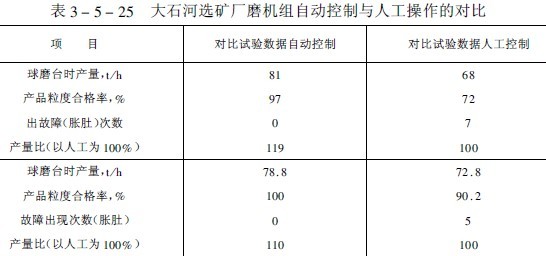 我國(guó)東風(fēng)螢石公司浮選廠和首鋼大石河選礦廠磨礦分級(jí)自動(dòng)控制經(jīng)驗(yàn)表明,采用自動(dòng)控制系統(tǒng)時(shí),磨礦操作的各項(xiàng)指標(biāo)的波動(dòng)范圍均比人工操作小(見(jiàn)表3-5-25和表3-5-26)。