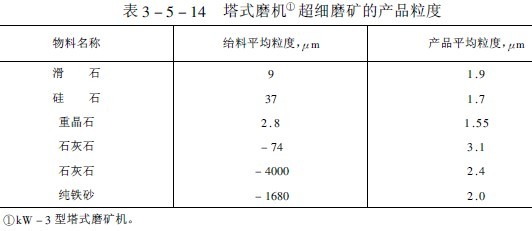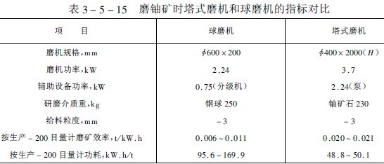 表3-5-14示出了利用塔式磨機磨碎不同物料獲得的產(chǎn)品細度,表3-5-15列出了利用球磨機和塔式磨機磨鈾礦石時的結(jié)果對比,從該試驗結(jié)果可以看出按產(chǎn)生一噸小于200目物料所消耗的電能計,塔式磨機比球磨機低一倍以上。