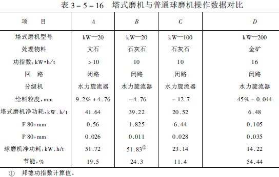 表3-5-16示出了美國科珀(Kopper)公司的某一子公司提供的塔式磨機與球磨機的工作性能對比結(jié)果,表中,例A、B是實驗室試驗結(jié)果;C是南方麥奇根煙氣脫硫系統(tǒng)磨機工作結(jié)果;D是裝在可蘭德湖拉卡礦業(yè)公司再磨回路中應(yīng)用情況,根據(jù)該公司的試驗結(jié)果得出下述見解: