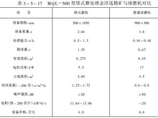 我國有關(guān)單位研制的MQL——500型螺旋攪拌塔式磨機也分干式、濕式兩種。濕式塔式磨機于1984年在大石河鐵礦選礦廠進行過半工業(yè)試驗,后來在金廠裕金礦用作浮選金礦的再磨,以滿足該廠下步氰化浸出的要求。該廠采用一段塔式磨機可以將小于350目占64%的金浮選精礦磨細到小于350目占99.74%,磨機利用系數(shù)為0.485噸/米3時,電能消耗為13.45千瓦/噸,鋼耗為4.65千克/噸,MQL——500型塔式磨機與球磨機工業(yè)試驗指標列于表3-5-17中。