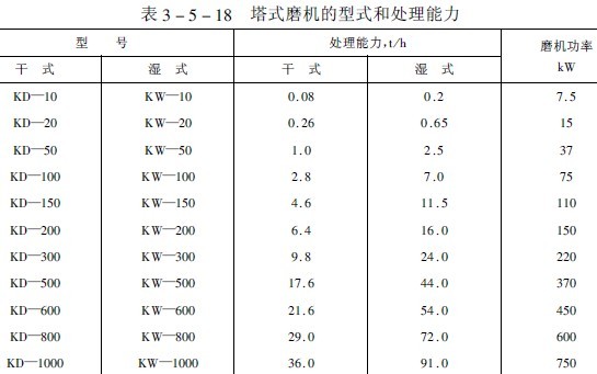 表3-5-18列出了日本生產(chǎn)的塔式磨機的系列產(chǎn)品,并列出了該系列產(chǎn)品處理給料粒度小于3毫米,產(chǎn)品粒度平均10微米的處理量(噸/時)。