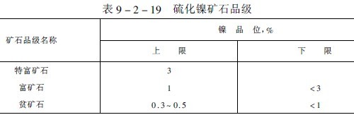 硫化鎳礦床的礦石又按硫化率,即呈硫化物狀態的(S sub Ni /sub )與全鎳(T sub Ni /sub )之比分為:原生礦石S sub Ni /sub /T sub Ni /sub 70%;混合礦石S sub Ni /sub /T sub Ni /sub 45~70%;氧化礦石S sub Ni /sub /T sub Ni /sub 45%。