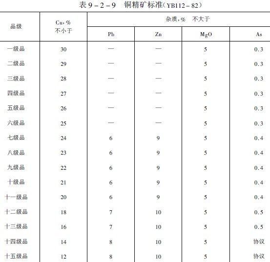 送往冶煉廠的銅精礦,由于礦石產地,礦石種類和銅選礦技術條件的不同,其化學成分和礦物組成是極其復雜的。冶煉廣對這些化學成分和礦物組成不作具體規定,僅根據冶煉方法,冶煉工藝特點及冶煉技術的不同,對某些成分加以適當限制。但出于冶煉對精料的要求,以及對選冶聯合成本的考慮,對入廠精礦的含銅品位規定了十五個等級(表9-2-9)。