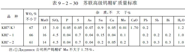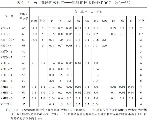 表9-2-29及表9-2-30為蘇聯國家鎢精礦產品標準,表9-1-31為國外質優鎢精礦產品標準。