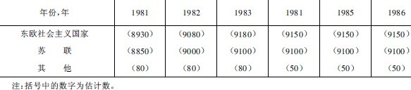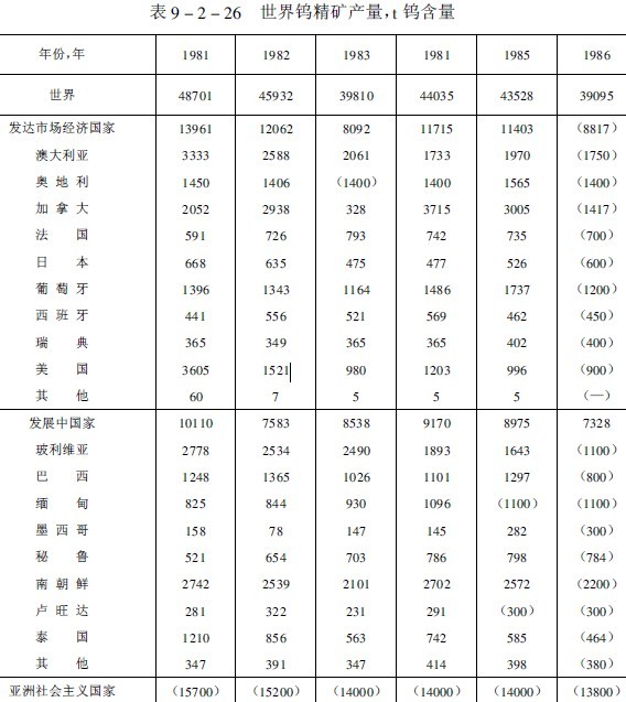根據聯合國貿易和發展會議商品委員會鎢委會1986年11月第18屆會議報告資料,近幾年世界鎢精礦的產量和消費量分別列于表9-2-26及表9-2-27。