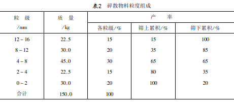 試驗結果處理的基本內容是計算產率。產率分為粒級產率與累積產率,粒級產率是該粒級的質量占被篩物料總質量的百分率,累積產率又分為篩上累積產率(又叫正累積)及篩下累積產率(又叫負累積)。正累積產率是大于某一篩孔的各粒級產率之和,負累積產率是小于某一篩孔的各粒級產率之和。在計算粒級產率時,“被篩物料總質量”可以用各粒級質量之和,也可以用原試樣的質量,此時把損失量加入較細級別,認為篩分時呈灰塵飛揚了。基本的篩分試驗記錄及結果處理如表2所示。